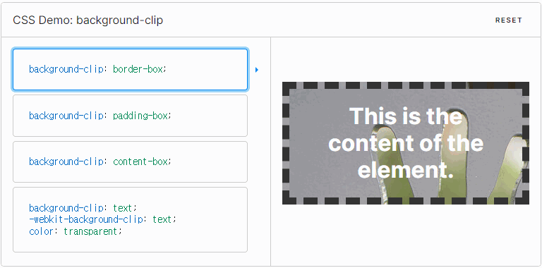 CSS background-clip 속성은 요소의 배경이 테두리, 안쪽 여백, 콘텐츠 상자 중 어디까지 차지할 지 지정합니다.