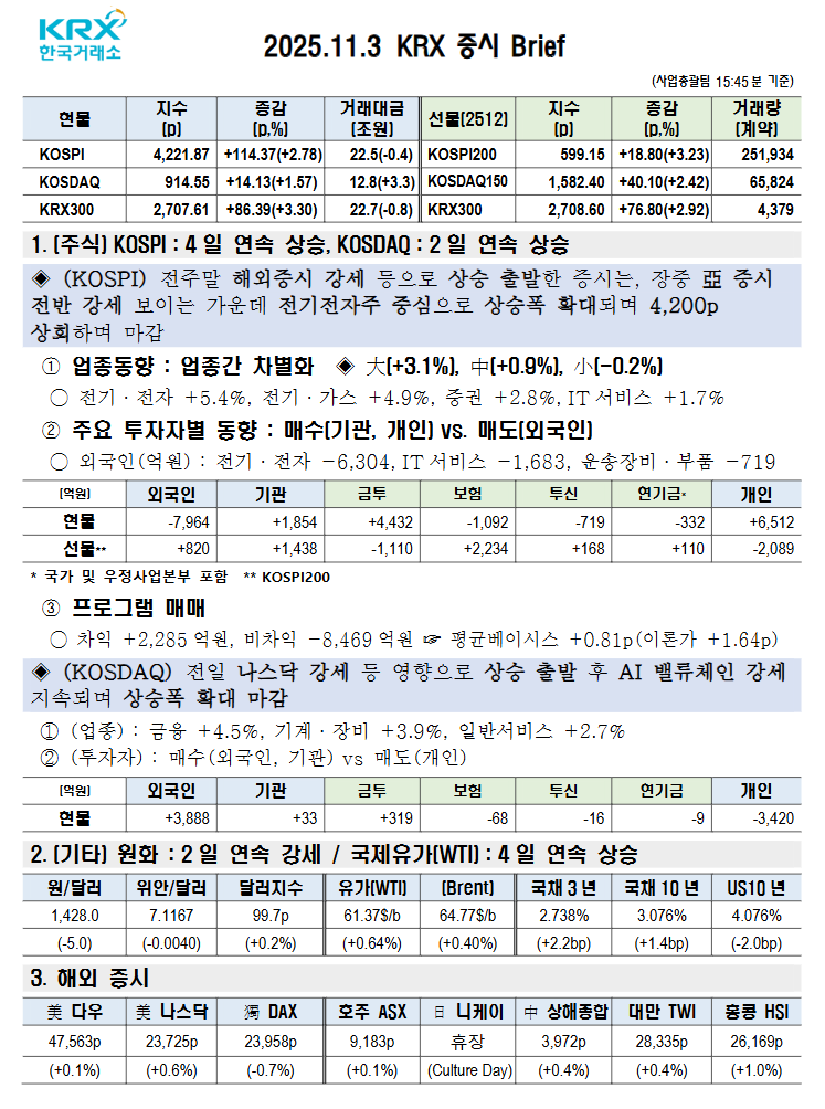 - 韓, AI 데이터센터 허브 도약 기대감 및 효성중공업, 3분기 어닝 서프라이즈 등에 전선/ 전력설비 테마 상승.
