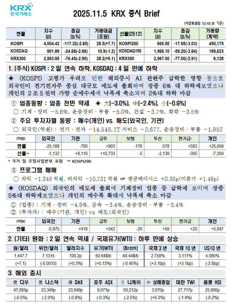- 美 AI 기술주 고평가 우려 속 필라델피아 반도체지수(-4.01%) 폭락 영향 등에 반도체 및 AI 관련 테마 등 하락.