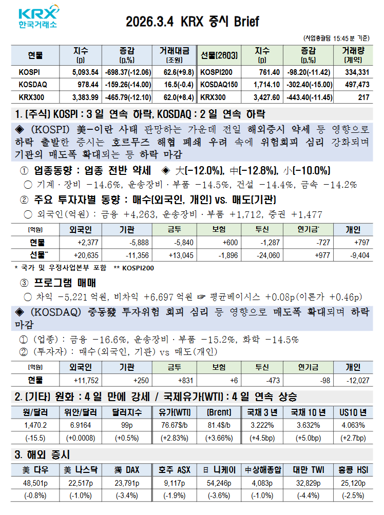 - 이날 국내증시는 오전 한때 양시장 동반 서킷브레이커가 발동되는 등 폭락세를 연출. 코스피지수는 美-이란 전쟁 확전 우려, 기관 순매도 등에 12% 넘게 폭락, 5,100선을 하회. 코스닥지수도 14% 폭락하며 1,000선을 하회.