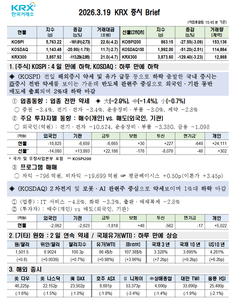 - 지난밤 뉴욕증시가 중동 전쟁 확전 우려 및 파월 의장 매파적 발언 등에 3대 지수 모두 하락한 가운데, 국내증시도 하락. 코스피지수는 외국인/기관 동반 순매도 속 3% 가까이 떨어지며 5,800선을 하회, 코스닥지수도 외국인/기관 동반 순매도 속 2% 가까이 하락. 특히, 이란 전쟁이 격화하는 가운데, 3월 美 FOMC의 매파적인 결과로 위험자산 선호심리가 위축되는 모습.