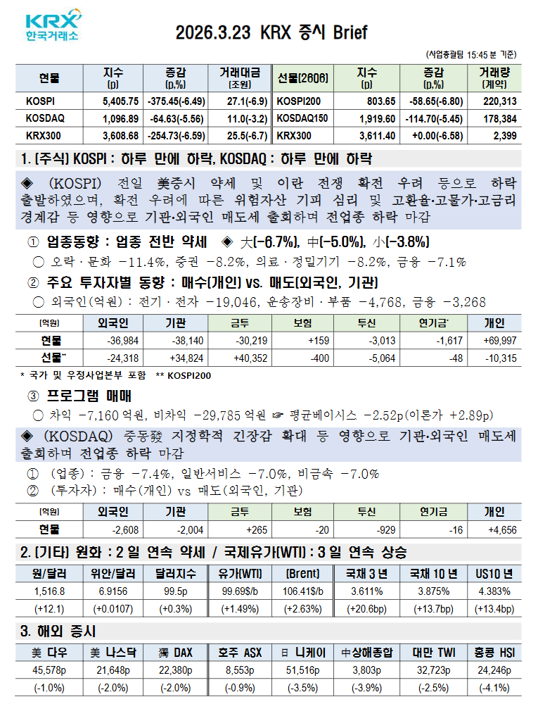 - ✅ 코스피 -6.49%: 미 증시 약세 및 이란 전쟁 확전 우려 → 위험자산 기피 심리 및 고환율, 고물가, 고금리 경계감 → 기관 및 외국인 매도세 출회하며 전업종 하락